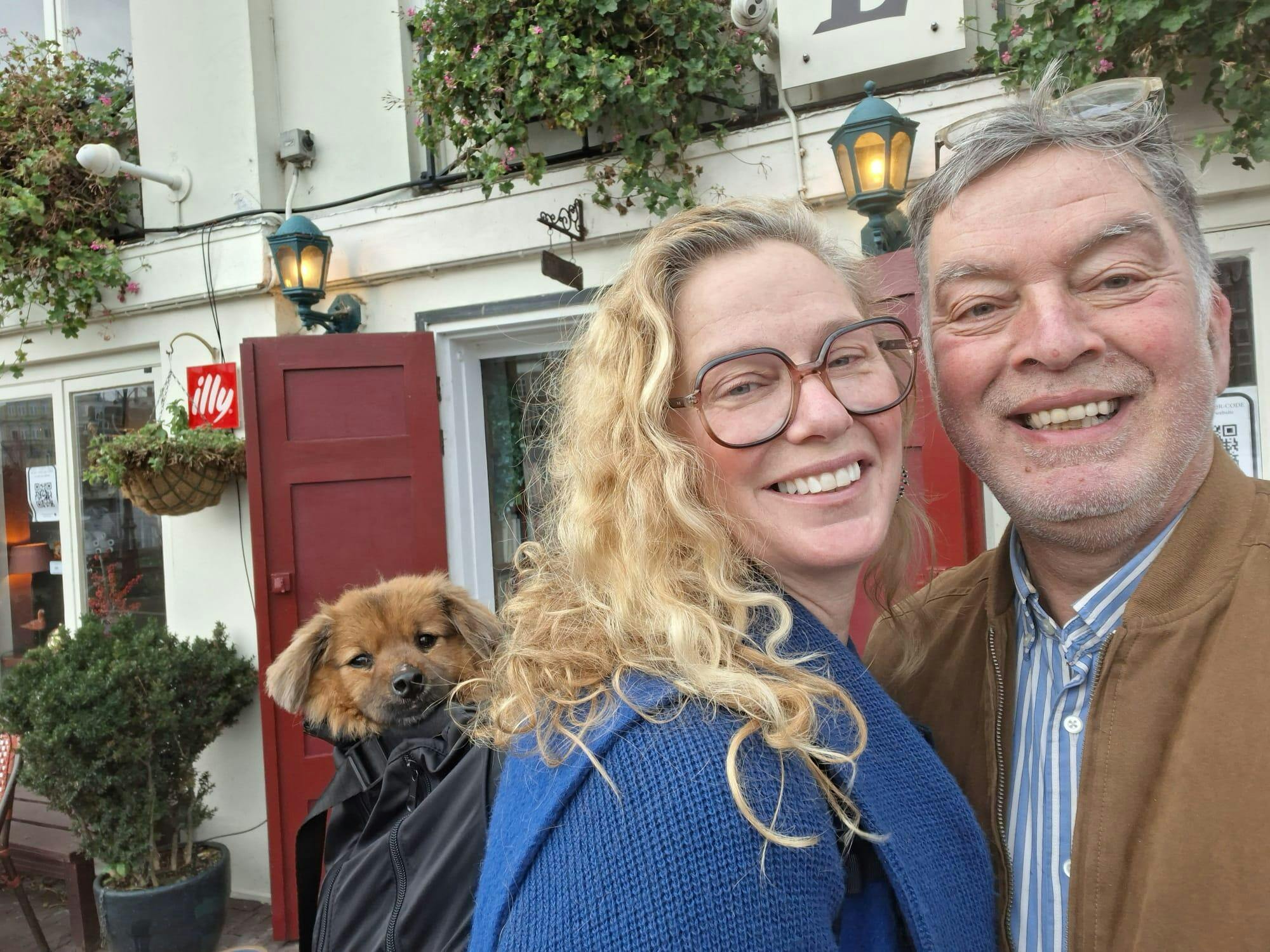 “Onze vorige hond liep altijd mee naast de fiets door De Pijp, zelfs zonder riem. Maar toen we naar Noord verhuisden, moesten we iets anders bedenken. De afstanden zijn simpelweg te groot. Daarom hebben we Suki vanaf het begin geleerd om mee te gaan in een fietskrat en een speciale rugzak.